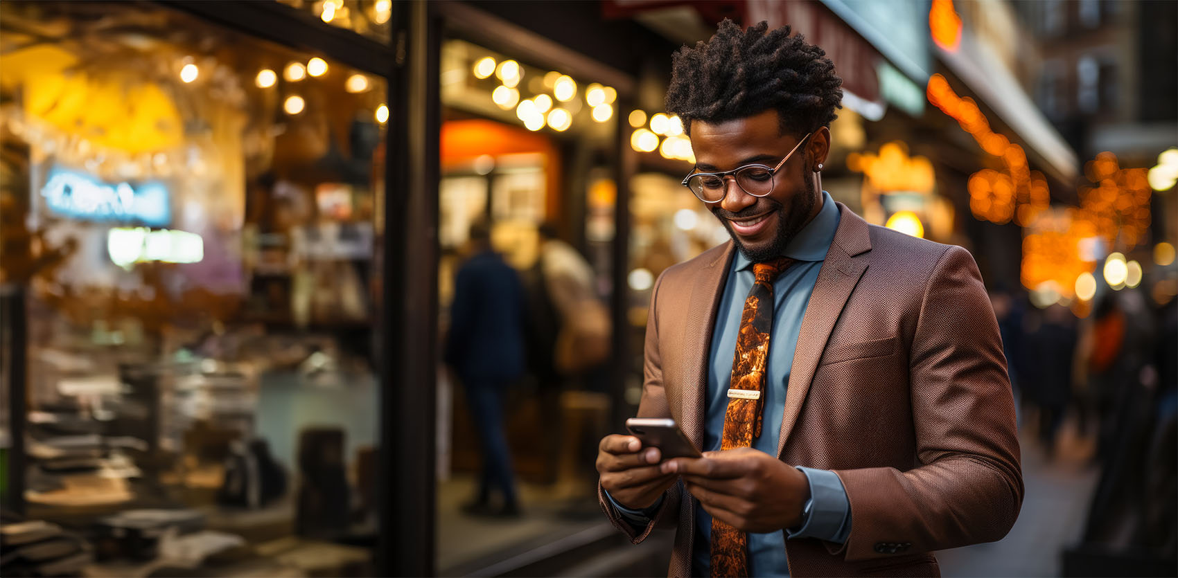 young-man-suit-smiling-reading-message-phone-while-standing-busy-evening-street